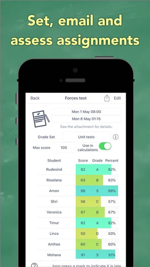 Set homework in the app then either type details or take a photo of your whiteboard. You can then choose to email the task to your students and set yourself a reminder for the due date. Once complete, you can send individual emails to the students with their scores.