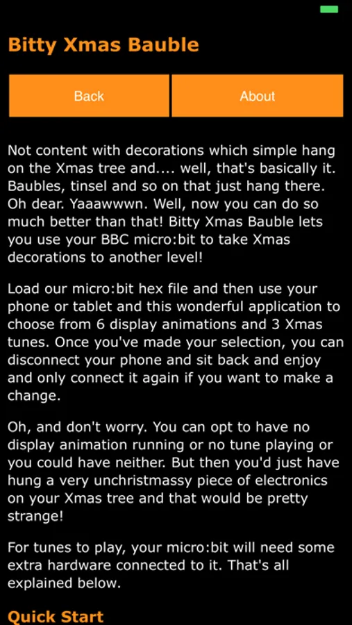 Liven up that Xmas tree! Hang a BBC micro:bit on it and use the Bitty Xmas Bauble app on your phone or tablet to make it display any one of 6 delightful LED animations and play any one of three Xmas tunes. Note that you must have the right code on your micro:bit. See below and https://bittysoftware.blogspot.com/p/faq.html