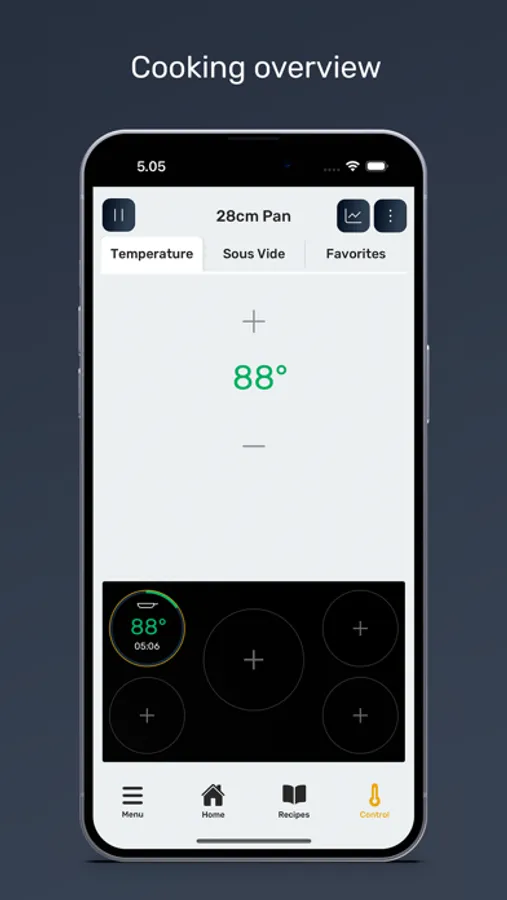 The Ztove app provides an overview of what happens on the Ztove cooktop while cooking. Every cooking zone can be controlled and monitored by setting exact temperatures, power, timers and run recipes. Every action is attached to a specific zone, and you can even dedicate a zone to the “sous vide method” — a method not possible on a regular cooktop.