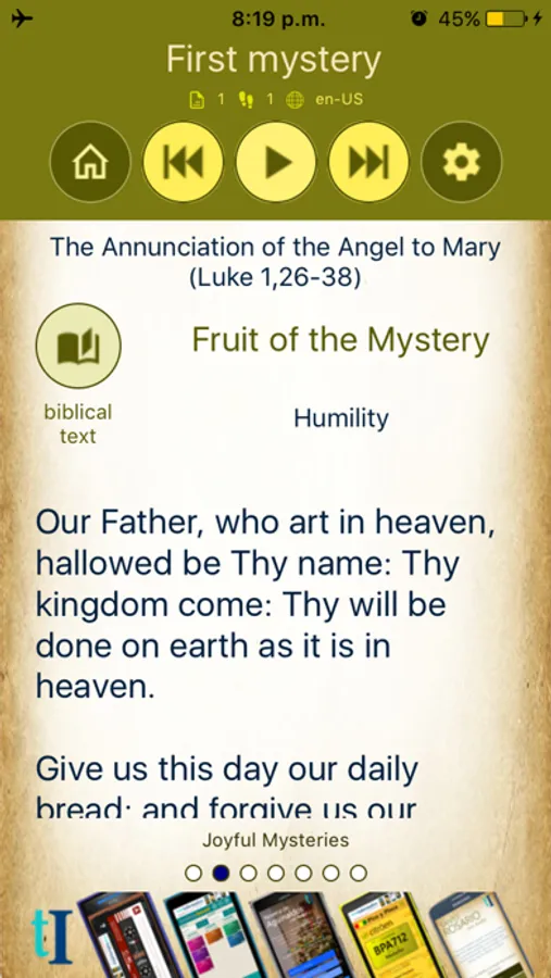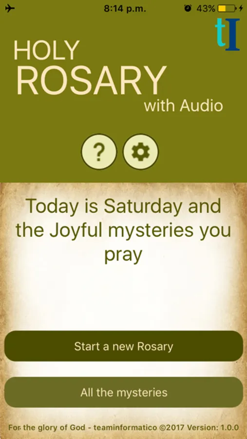 The App displays the current day and automatically creates all the Rosary with all the mysteries. Carries accounts from 10 Hail Mary for each mystery and saved in the device progress the rosary so it can continue in the event of interruption.