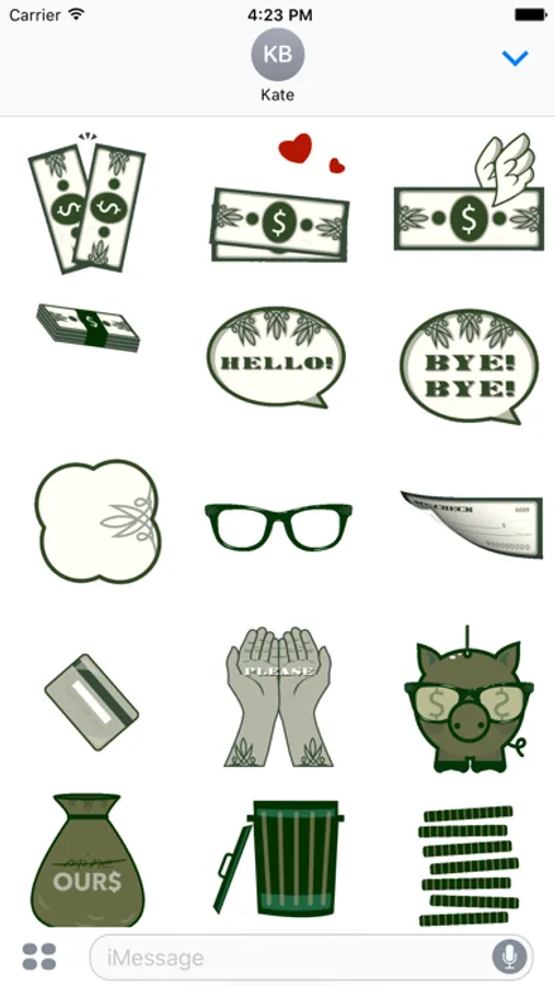 Owe money to a friend? Send an IOU Dollar Bill to let them know you haven’t forgotten. Do you feel like your money disappears? Express yourself with the Bye! Bye! Speech Bubble, the Flying Dollar Bill, or throw a Money Stack in the Trash Can. Need money? Say please with the Outstretched Hands sticker. Are you seeing green? Put the Money Glasses on a photo, or customize a Dollar Bill or Coin with your own portrait.