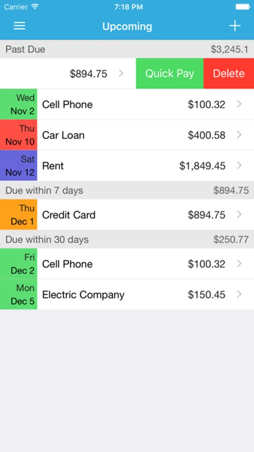 In Upcoming screen, you will see your past due, due within 3 days, due within 7 days, and due within 30 days. So you will never miss your bills.
