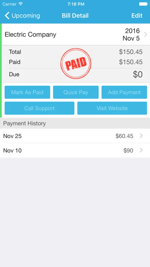 You can also view bills in calendar mode and see all of your bills within any month and day. Bill are filtered by paid or unpaid status to help you view bills better.
