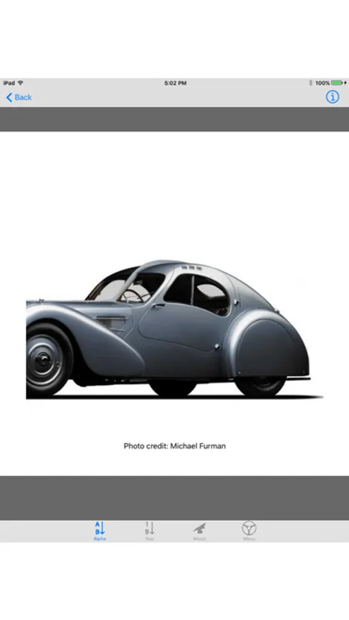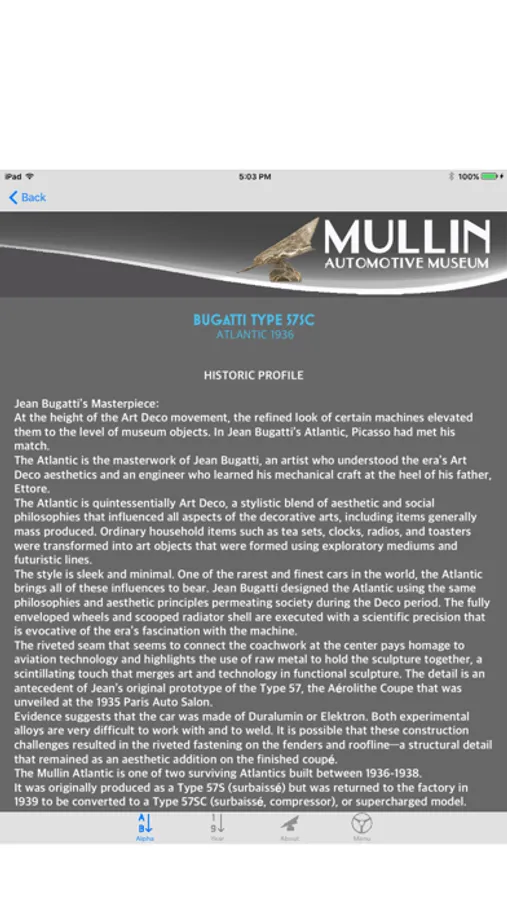 Mullin Automotive Museum app displays images and information about the cars and various Art Deco collections housed in the Mullin Automotive Museum in Oxnard, California.