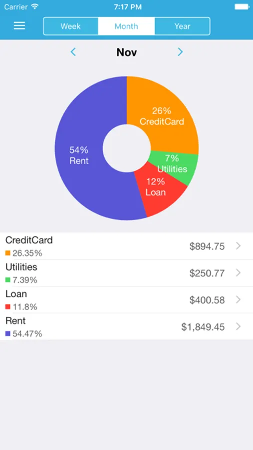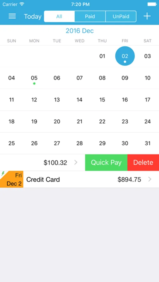 You can also view bills in calendar mode and see all of your bills within any month and day. Bill are filtered by paid or unpaid status to help you view bills better.