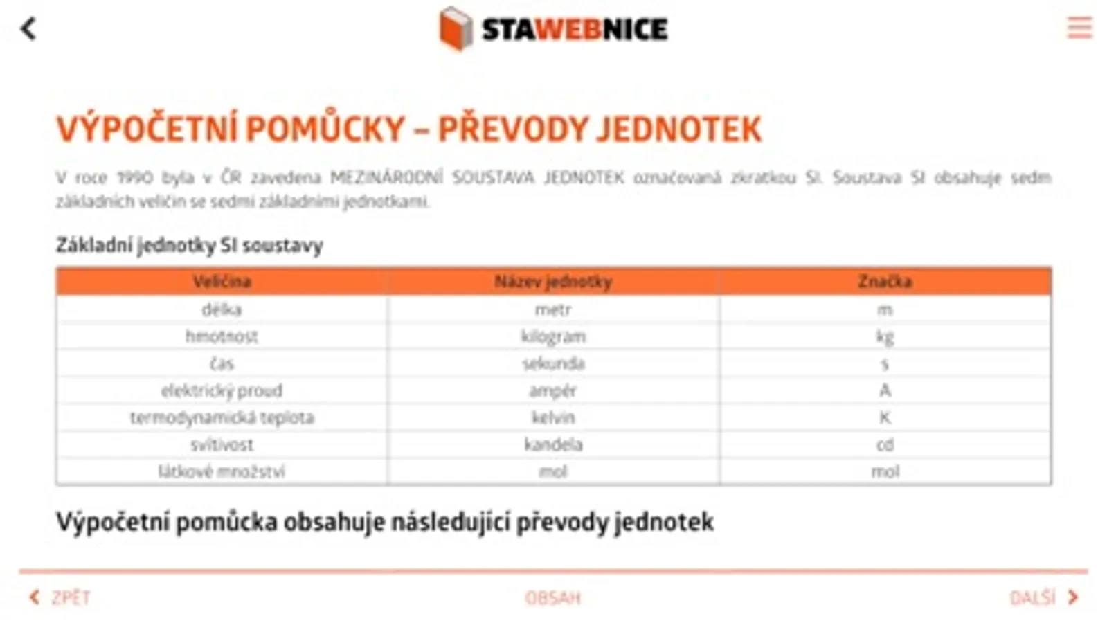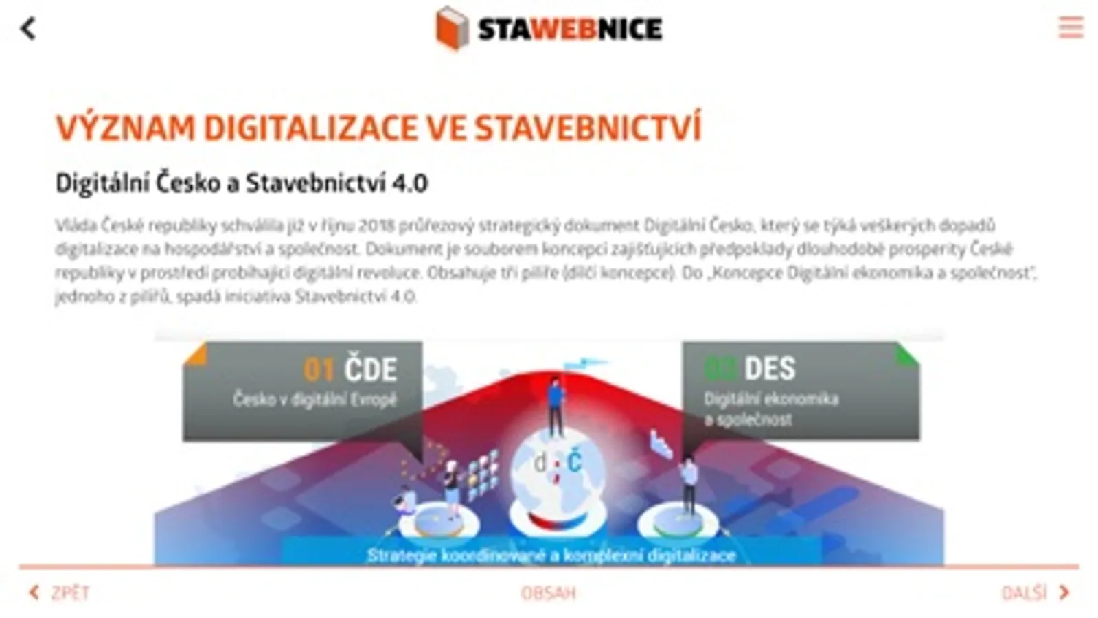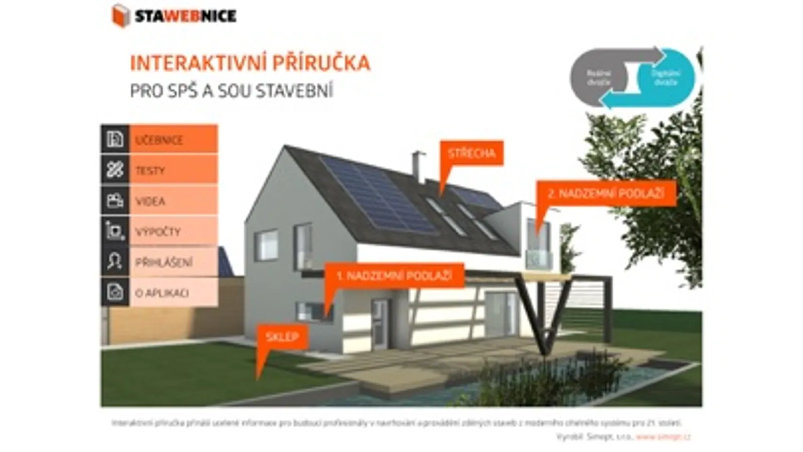 Stawebnice je interaktivní příručka pro budoucí profesionály v oblasti stavebnictví (primárně určena pro studenty a pedagogy SPŠ a SOU stavební). Tuto aplikaci lze využít jak v samotných hodinách při výkladu odborné látky, tak pro samostudium. Aplikaci mohou využívat i ostatní zájemci o stavební obor.