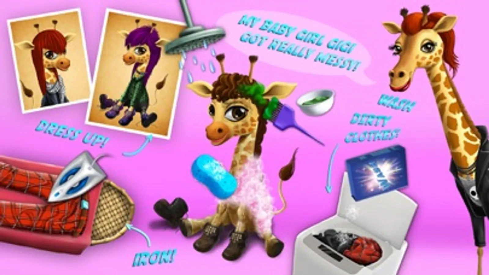 · Shower baby giraffe, wash her dirty clothes and color her curly hair green!