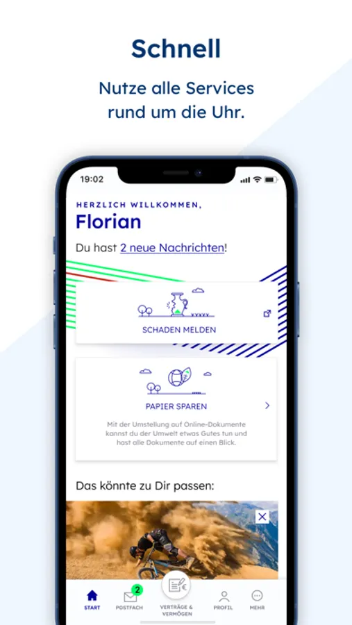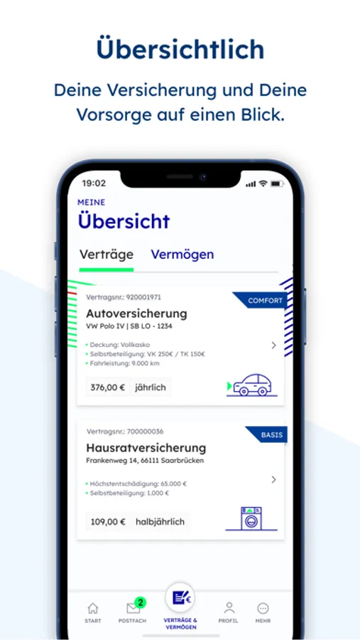 Alle wichtigen Infos rund um Deine Versicherung erhältst Du direkt in Dein Postfach. So bist Du immer top informiert und schonst auch noch die Umwelt, weil Du jede Menge Papier sparst. Zudem fällt das lästige Aktenwälzen weg, weil Du alle wichtigen Vertragsdetails schnell und übersichtlich checkst.