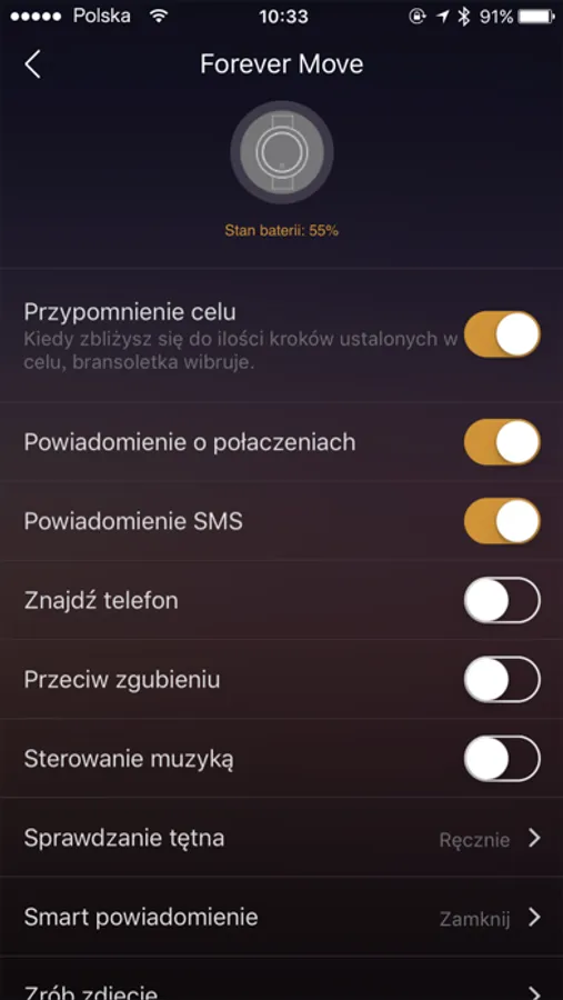 Ustaw informowanie o połączeniach i wiadomościach sms. Bransoletka zawibruje, informując Cię o połączeniu lub otrzymaniu wiadomości sms.