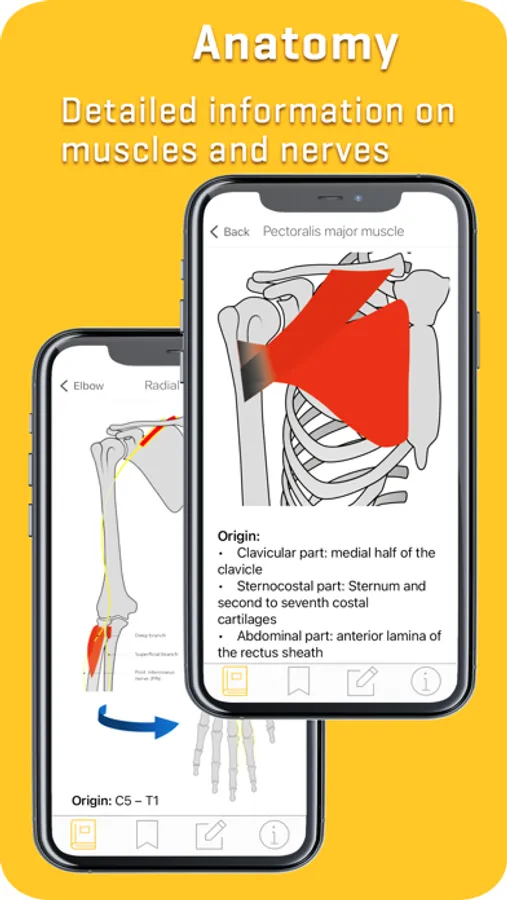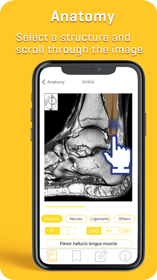 In the anatomy section you can scroll through image sequences and select structures by tapping on them. Alternatively, selection menus are displayed. For muscles and nerves, there are also chapters with all the important anatomical information.