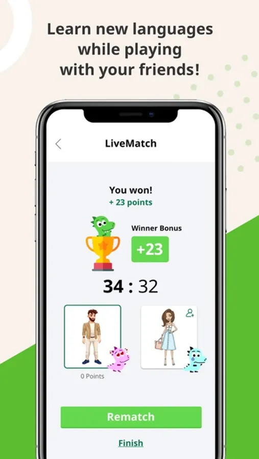 - Play with friends in real time in a LiveMatch: challenge your friends to fun, interactive vocabulary games called LiveMatches – simply invite them via WhatsApp/Messenger/Email/text message. Language learning comes naturally when it’s embedded in a playful context. LiveMatch is the most amazing feature! Everyone loves LiveMatch. Challenge your friends now!