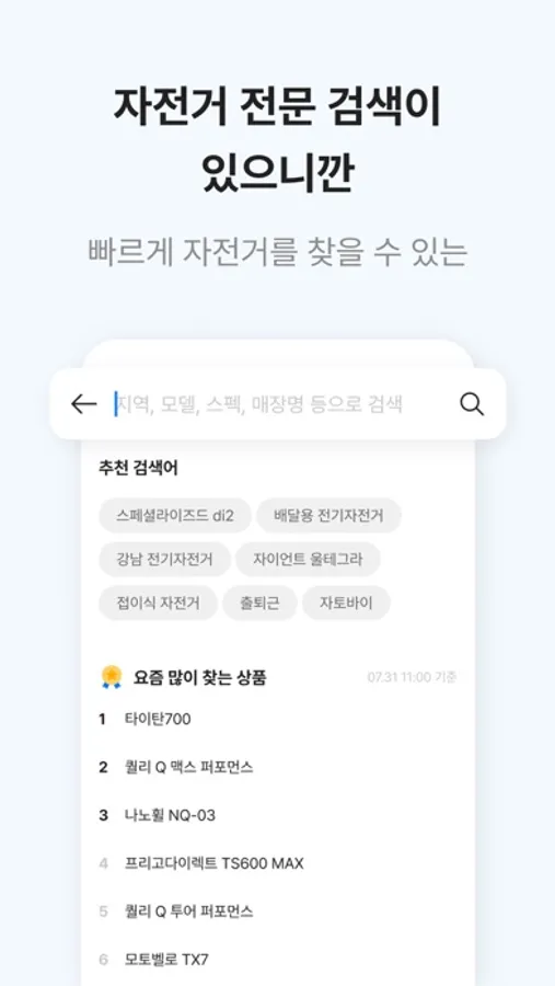 원하는 자전거를 찾기 어려우세요? ‘라이클’에서는 자전거에 최적화된 검색 알고리즘이 적용돼, 원하는 자전거를 가장 쉽게 찾을 수 있어요. 라이클만의 전문 검색 기능을 통해 한층 업그레이드된 검색 서비스를 경험해 보세요.