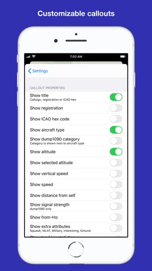 • Details are fully configurable and includes callsign, registration, ICAO hex code, altitude, speed, vertical speed, heading, aircraft type, squawk code, MLAT, latitude/longitude and more