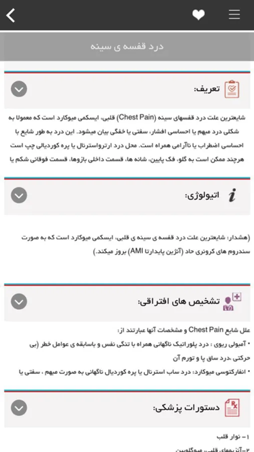 اپلیکیشن اورژانس های قلب شامل مجموعه از اوردر های بیماری های قلبی می باشد که در زمینه های زیر ارایه شده است: