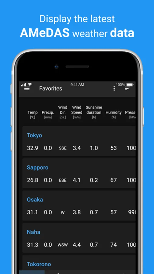 - "Add to Favorites" function for checking several stations weather observation data in a list.