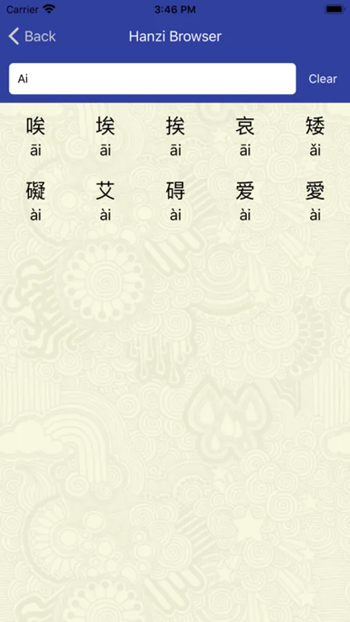 Search character by typing the hanzi, or simply by typing its pinyin tone, like Wo, Ai, Ni.