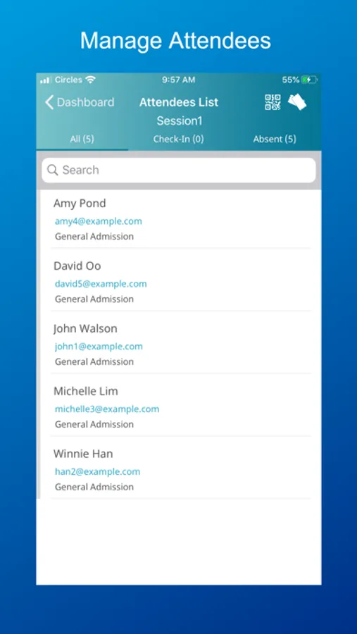 For events issuing QR code e-ticket to their guests, it allows to easily scan and verify QR code ticket and track attendance stats with real-time dashboard. It also allows to easily search attendees by name, email, etc.