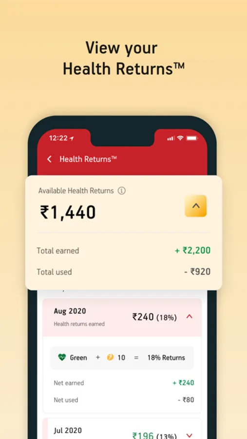 # View your HealthReturns™ balance: Health Returns is earned by collecting Active Days. HealthReturns™can be used to buy medicines and pay for diagnostic tests, to pay for any health emergency irrespective of whether it is covered by the policy, or to pay your next policy premium.