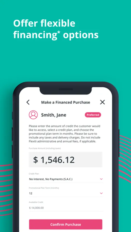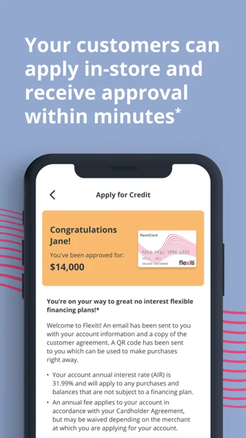 Offer your customers flexible financing with Flexiti. The paperless credit application only takes minutes to complete and upon approval, your customers can use their FlexitiCard instantly to finance their purchases anywhere within the Flexiti Network. A wide range of financing plans with different terms are available to offer your customers. If you would like to join the Flexiti Network, visit flexiti.com/merchants.