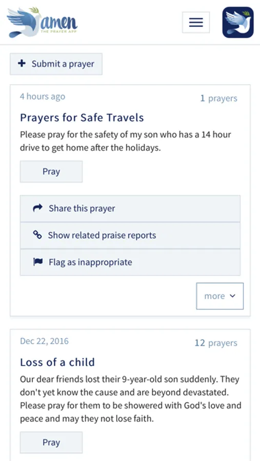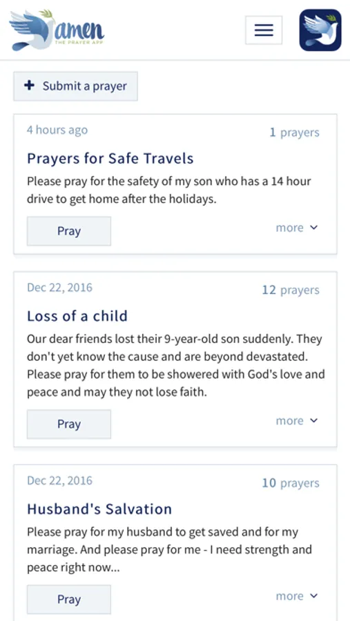 Amen: The Prayer App is designed so you can simply post a prayer request and receive a notification every time someone prays for you. It's designed to give you a simple and easy prayer app in the palm of your hands. Anyone--from anywhere, at any time--can now find hope, support and encouragement when they need it most. Whether your need for prayer comes during the hours of your work day, the middle of the night, or at the start of the morning - Amen: The Prayer App brings you to a community of hopefuls lifting you in your need.