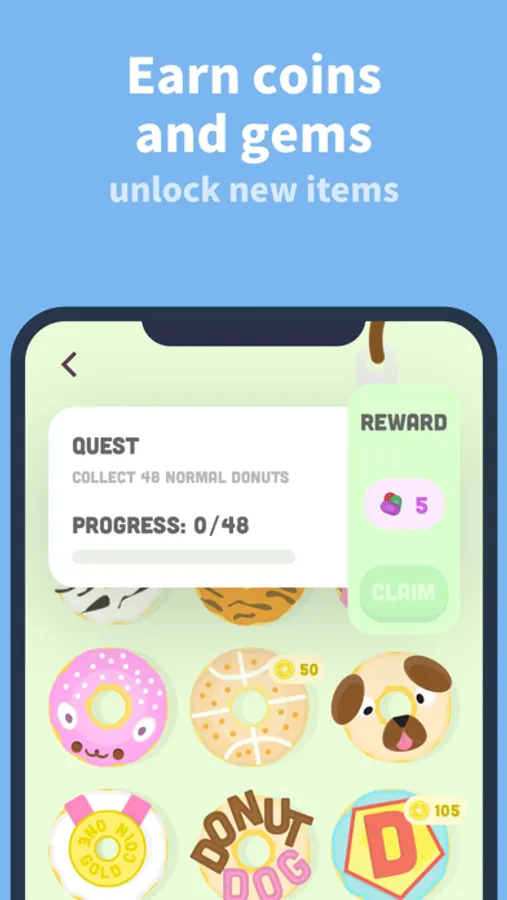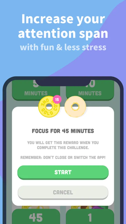 1) Start a focus challenge with our gamified productivity app and earn rewards such as donuts, gems, and coins.