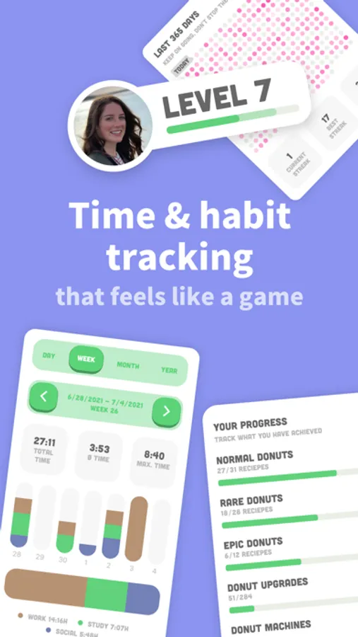 But beware of distractions! If you leave the app, your donut machine will stop. The sense of achievement and responsibility for Focus will motivate you to stay away from your phone and get more things done. Your progress is displayed with detailed statistics that help with time management and reduce screen time.