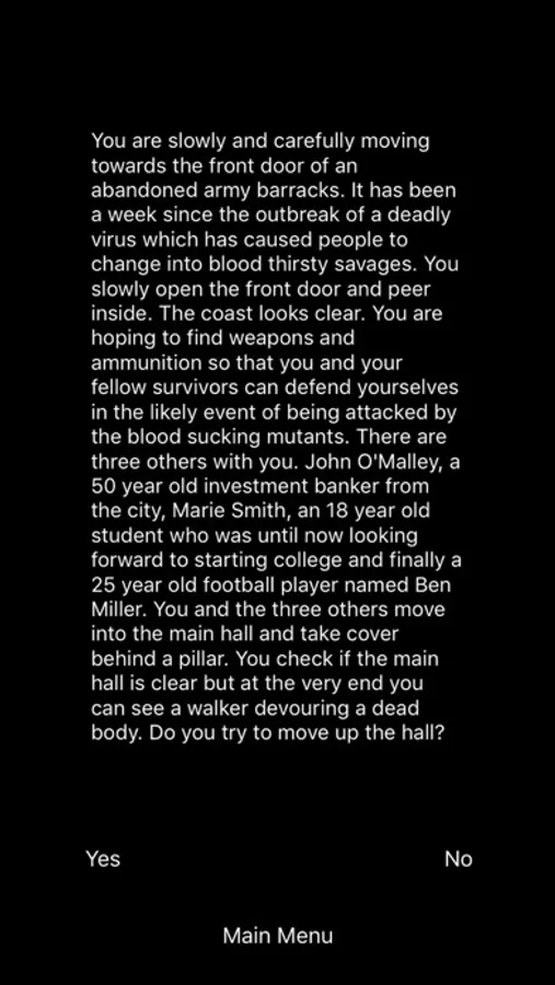 This is an interactive story where you must make the right decisions in order to finish the story alive.