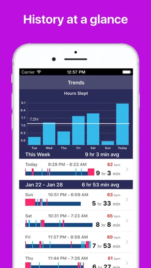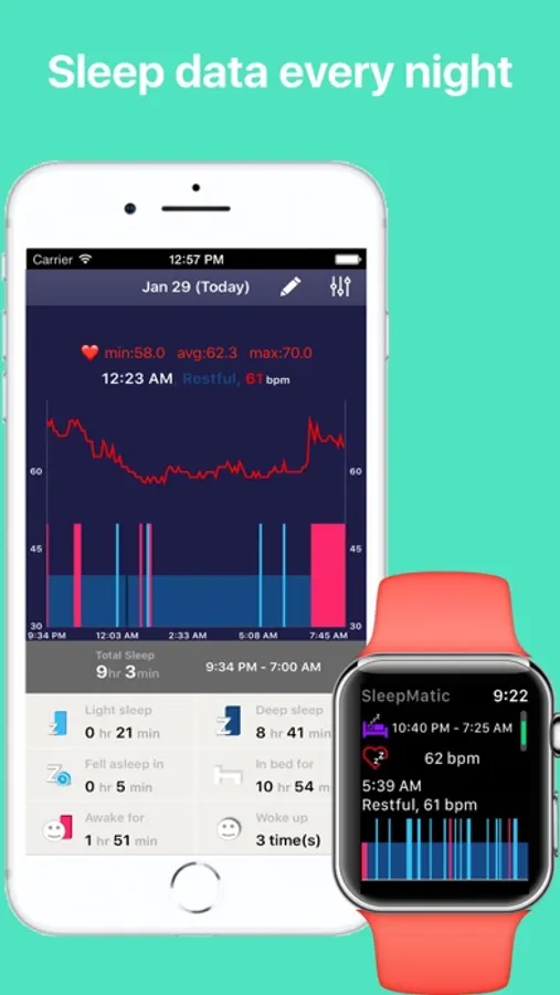 - See details of each night's sleep, including when you get in bed, when you fall asleep, when you wake up, when you get out of bed, and your restless/restful period during the night.