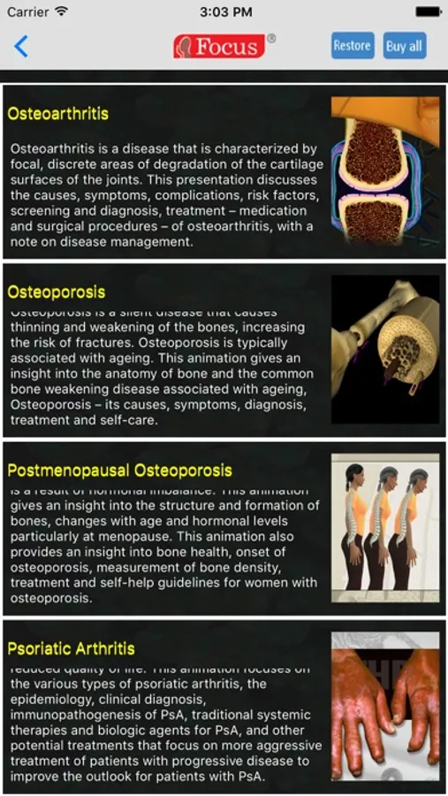 With this application, you can download animation titles on various diseases and disorders of the muscular and skeletal system that explain the pathology and immunology of the conditions, their symptoms, causes, diagnosis, risks and treatment - therapies, procedures or techniques, including biological therapies and life style changes. The animations simplify medical and health information, since visual media is particularly well suited to the science of medicine. It is possible to perceive and effortlessly understand the disease conditions through a virtual tour of the human system in these extremely accurate and incredible animation videos accompanied by audio, created with the expertise and support of internationally reputed opinion leaders.