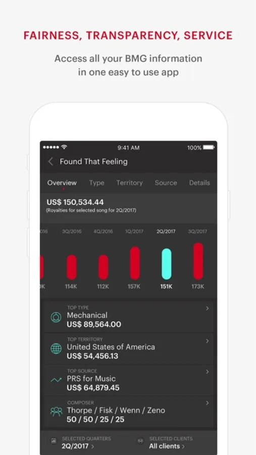 The myBMG App is the go-to place for BMG clients to view and analyse their royalty and repertoire details. Instantly see your earnings and key information, right from the palm of your hand.