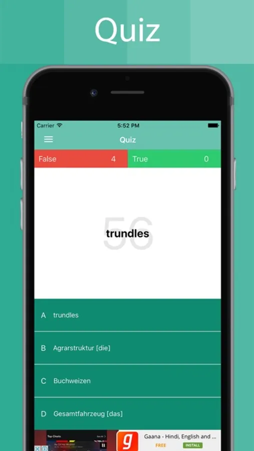 This German Dictionary Contains Quiz too. you can test you German skills using this multiple choice quiz and you can improve your German.