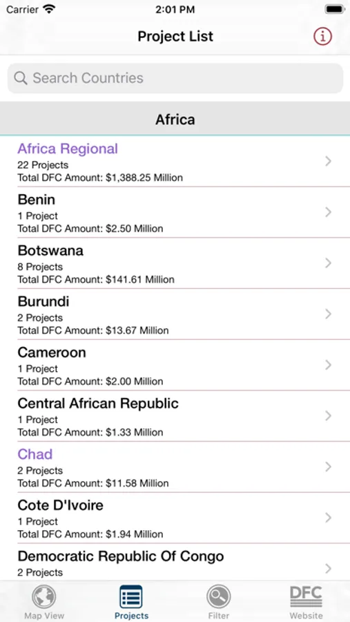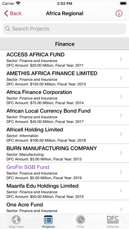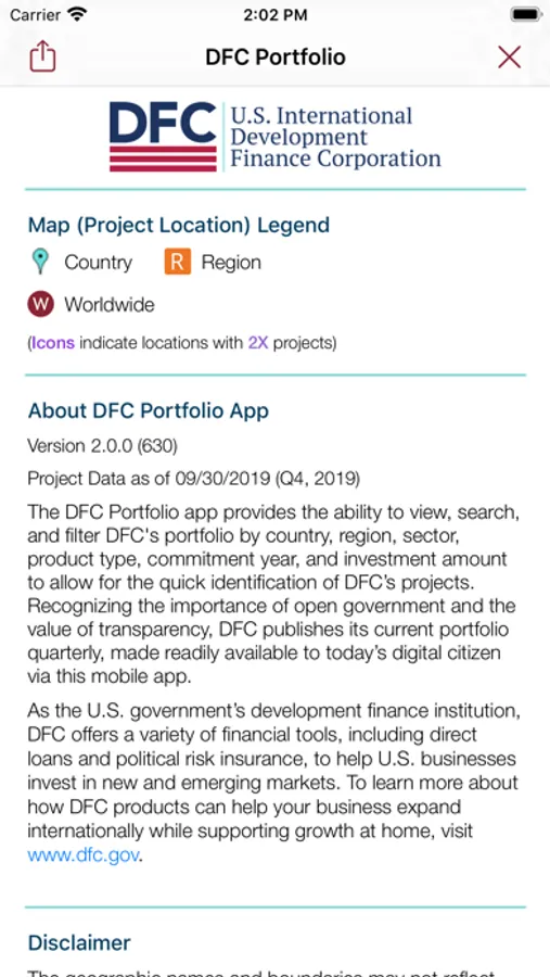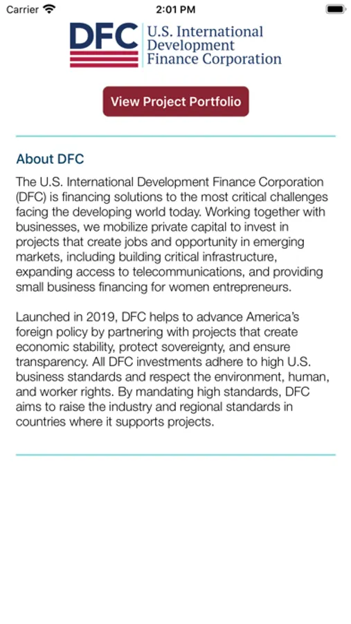 The DFC Portfolio app provides the ability to view, search, and filter DFC’s project portfolio by country, region, sector, product type, commitment year, and investment amount to allow for the quick identification of DFC’s projects. Recognizing the importance of open government and the value of transparency, DFC publishes its current portfolio quarterly, made readily available to today’s digital citizen via this mobile app.