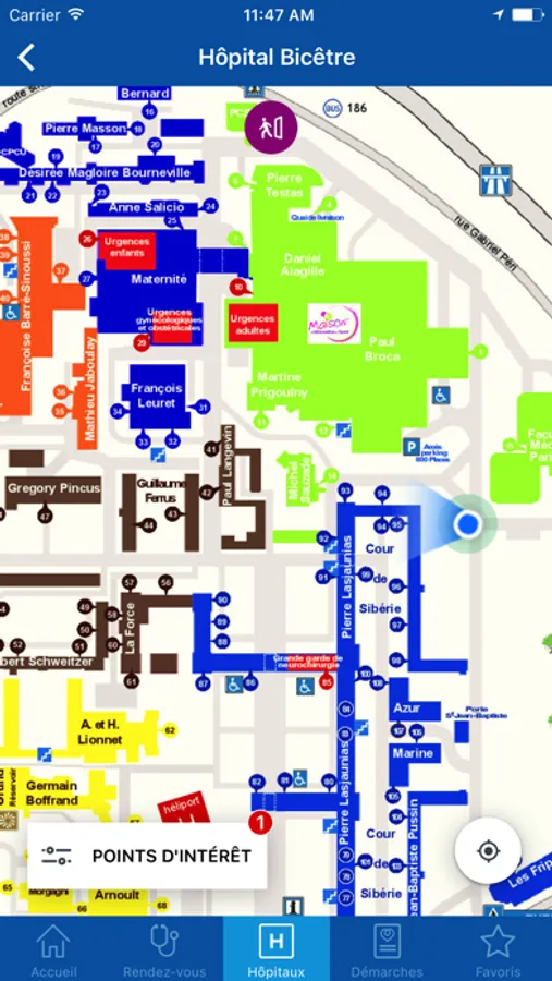 • se repérer entre les différents bâtiments de l’hôpital grâce à la géolocalisation outdoor ;