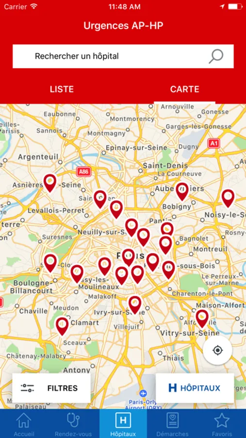• localiser rapidement et s’orienter jusqu’à l’un des 39 hôpitaux de l’AP-HP et vers les services d’urgences ;