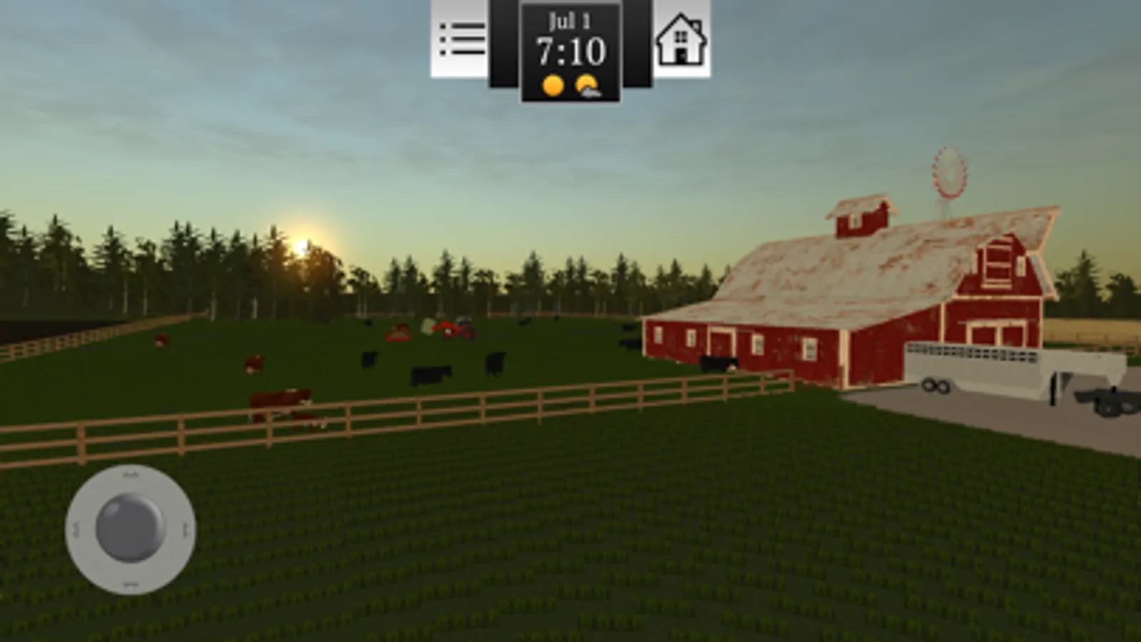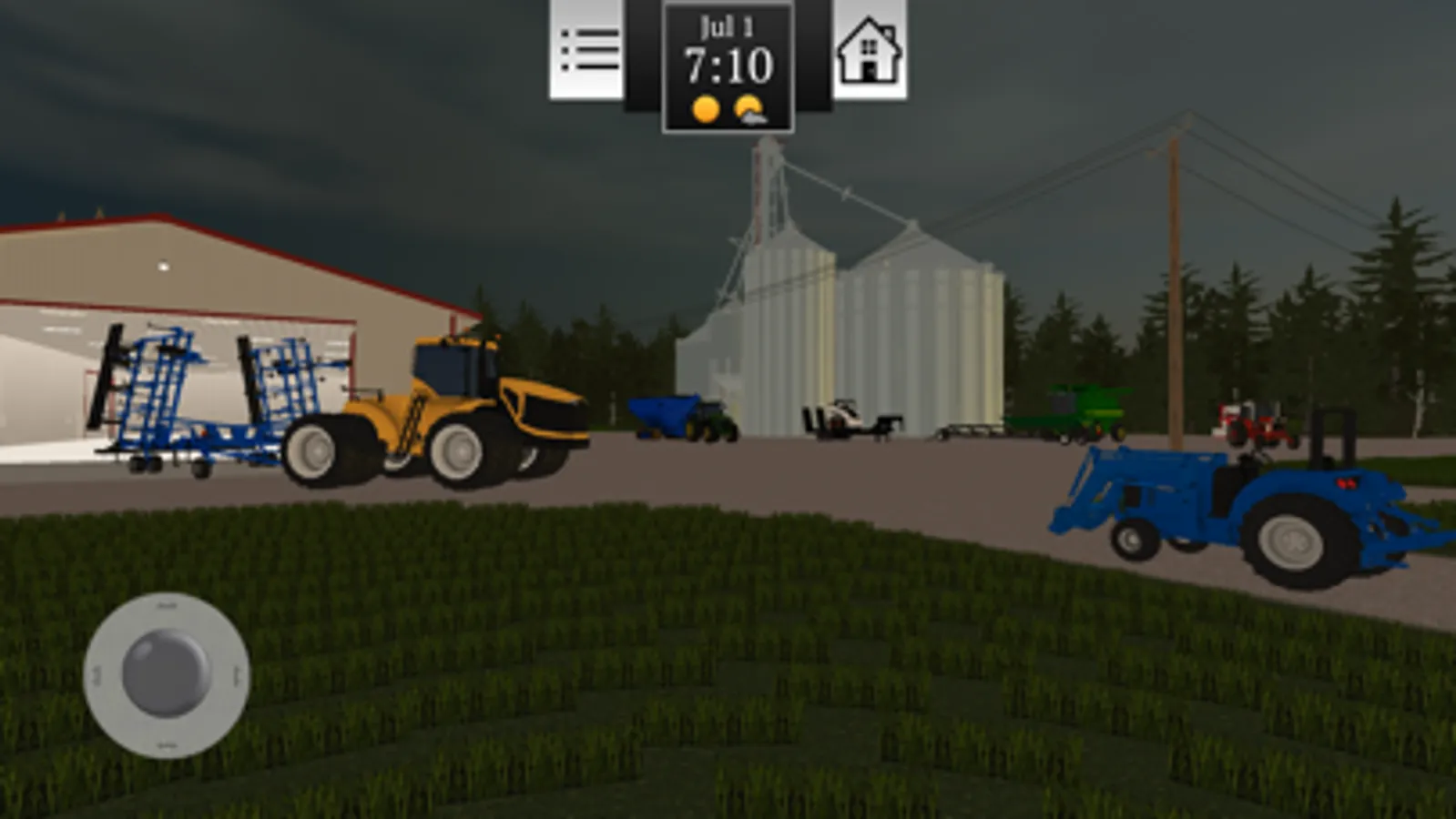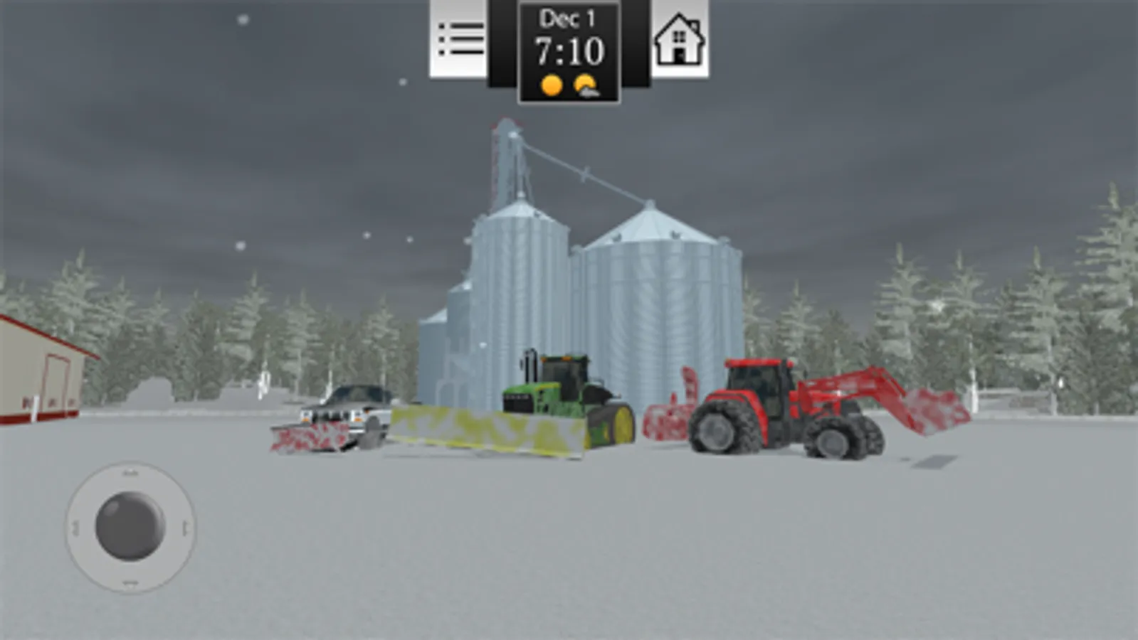 Watch the weather as rain and sun affects the growth and harvest of crops! Too much rain and your fields become muddy. A hard snow in winter will require you to hook up the snow plows to get out of the lot.