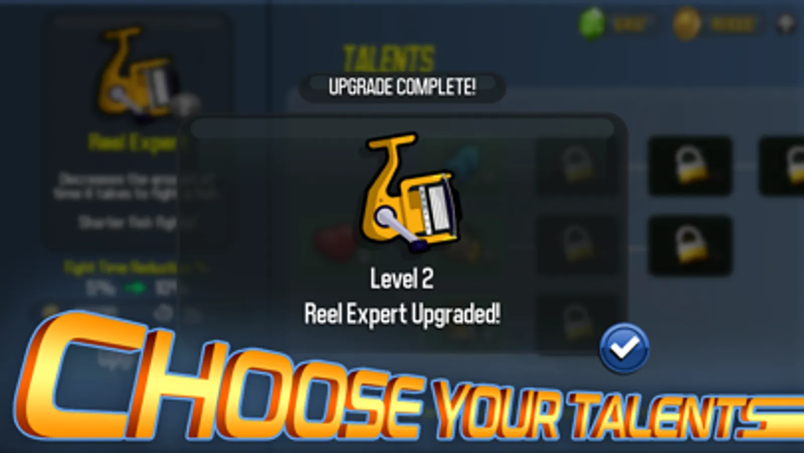 Level up and gain valuable fishing talents that will help you catch more fish. Will you become a Reel Expert? Do you want Lightning Reflexes? Or will you upgrade to Master Angler, the choice is yours!