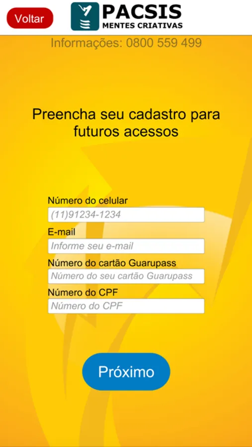 Preencha o número de seu cartão Guarupass. Normalmente esse número está impresso em seu cartão Guarupass no canto inferior direito.