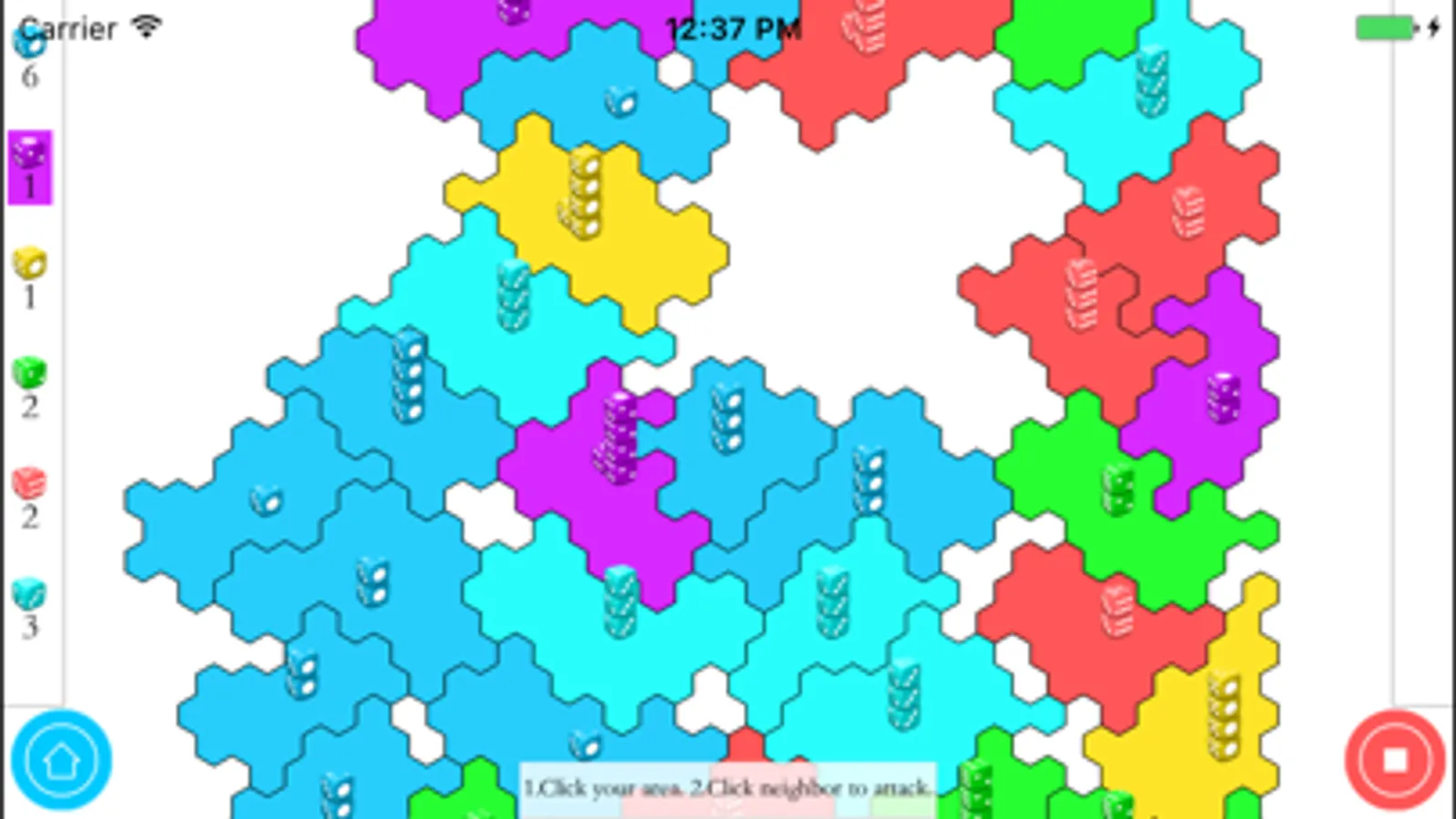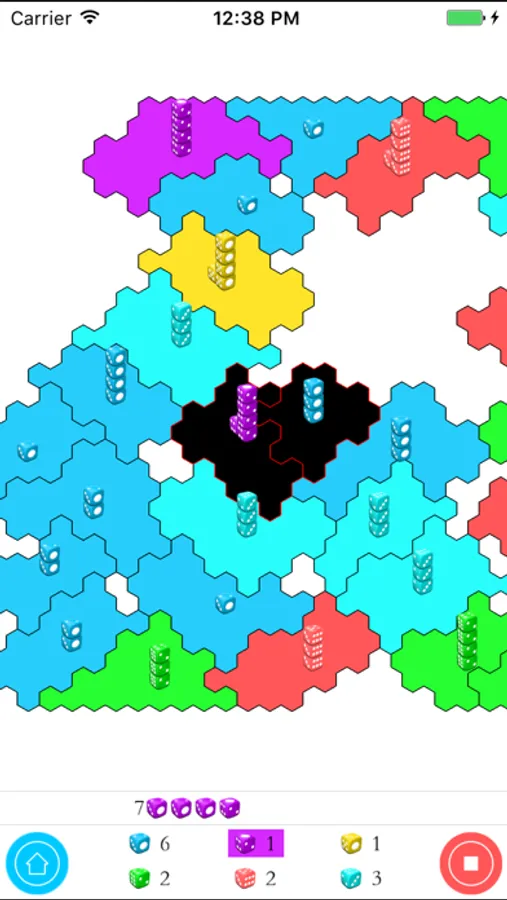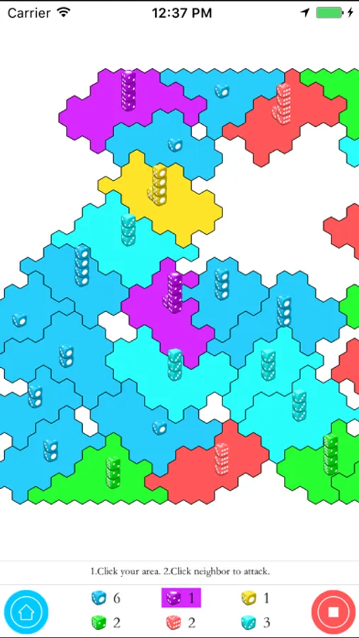 A player is then randomly selected to go first. Players take turns to attack and hold neighboring territories. In order to alleviate concerns that starting last (7th) in the first round is a disadvantage, the 6th and 7th players to play receive a one die bonus.