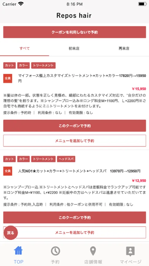 お得なクーポンが配信されます。ネット予約時にクーポン利用での予約も可能なので来店時もスムーズに施術頂けます。