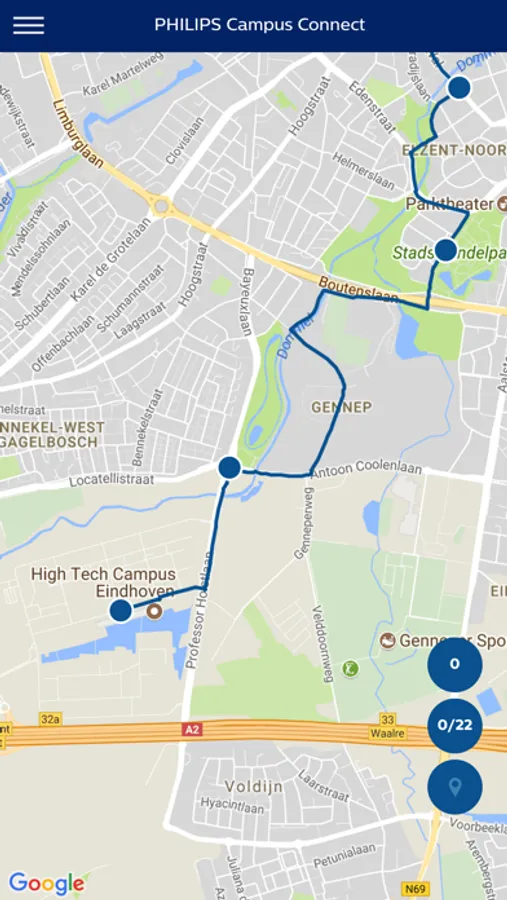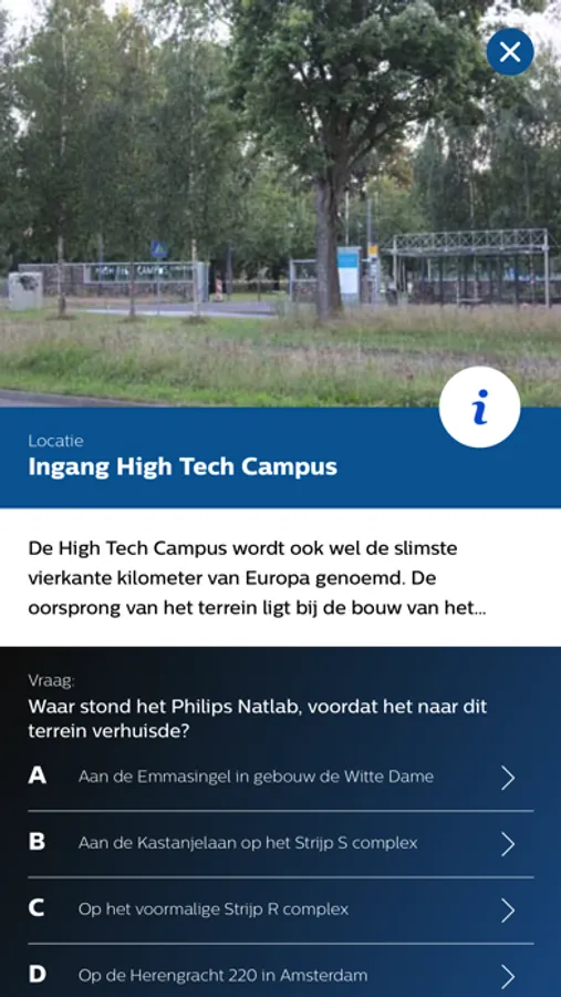 Deze boeiende route van 15 kilometer verbindt de Campus Zuid (High Tech Campus Eindhoven) en de Campus Noord (in Best) van het Philips Innovatie Centrum Eindhoven en laat u op een sportieve wijze kennismaken met het indrukwekkende industriële erfgoed van Philips door middel van quizvragen. De tocht voert langs markante gebouwen en locaties, die van grote betekenis zijn geweest voor de ontwikkeling van Philips en de regio Eindhoven. Ook zult u schitterende stukken natuur doorkruisen.