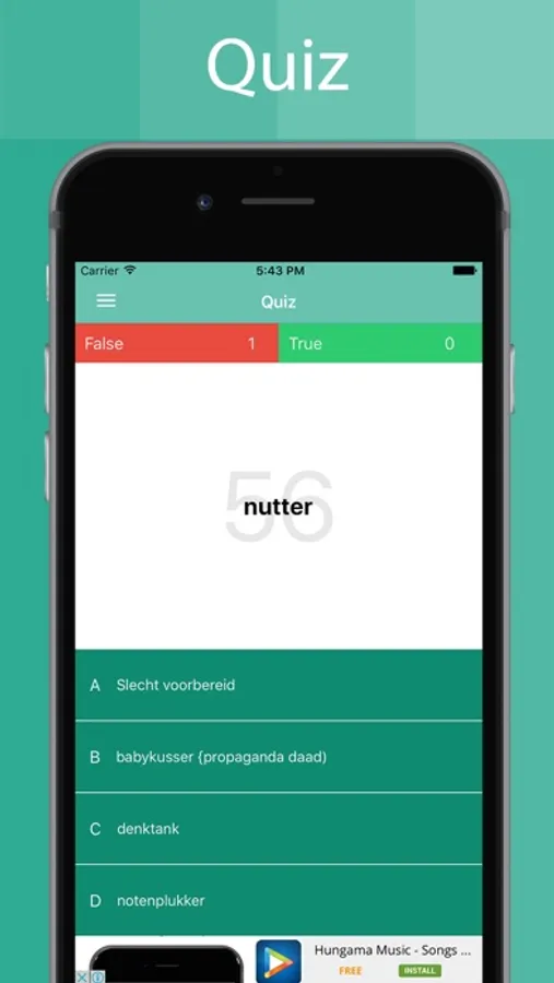 This Dutch Dictionary Contains Quiz too. you can test you Dutch skills using this multiple choice quiz and you can improve your Dutch.