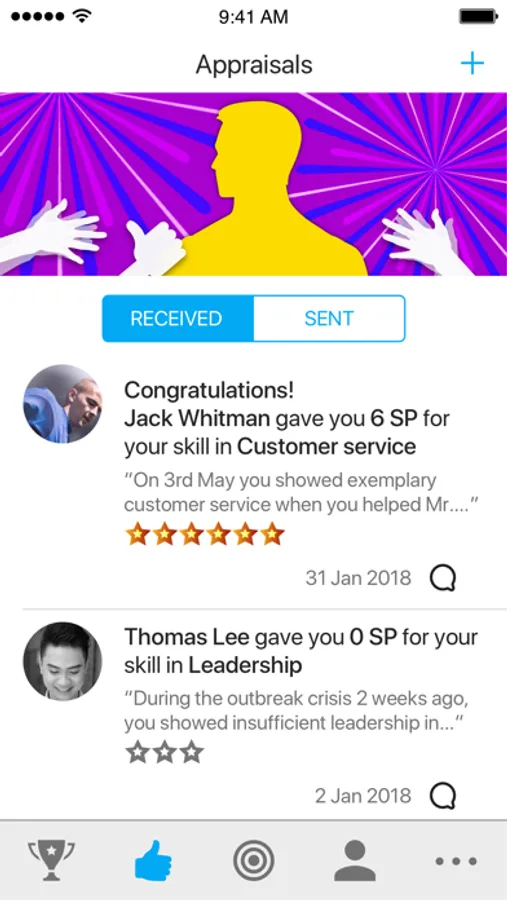 Scoreboard: Measure & motivate yourself by monitoring progress charts. Track your Skill Points (SP) every time someone sends you a staff appraisal. Personal Improvements will never be boring or tiresome with aPraise! Turn your job into a game! Make your workplace a game room