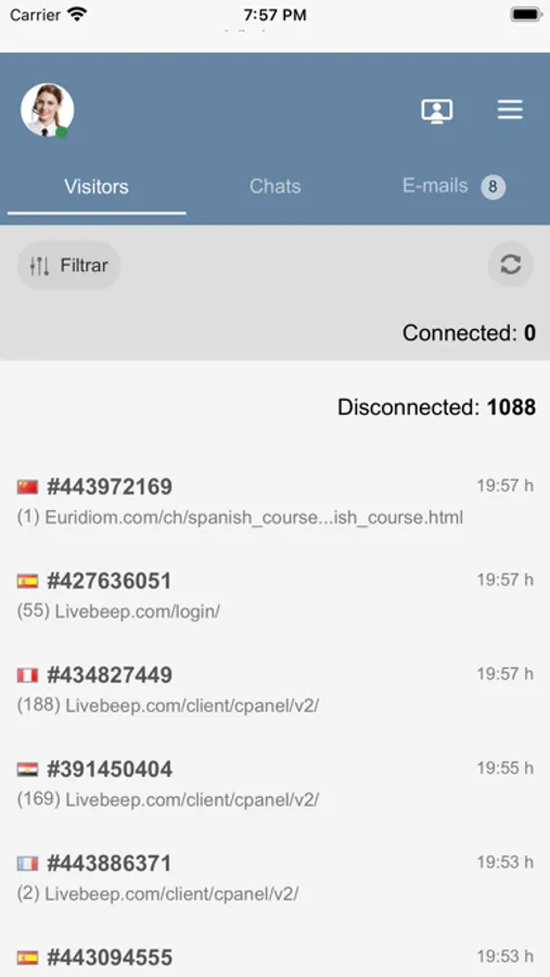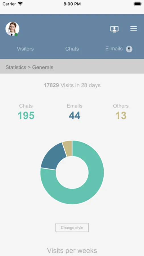 By clicking on your profile photo, you'll be able to change your status: available, busy, away. Remember that if you're available, your visitors may contact you by chat. When you can not attend chats, don't forget to change your status to busy or away.