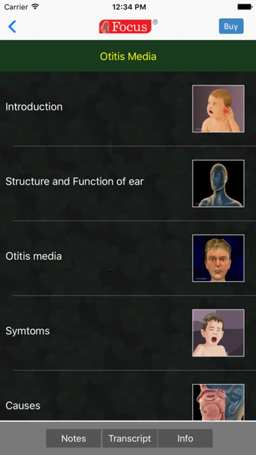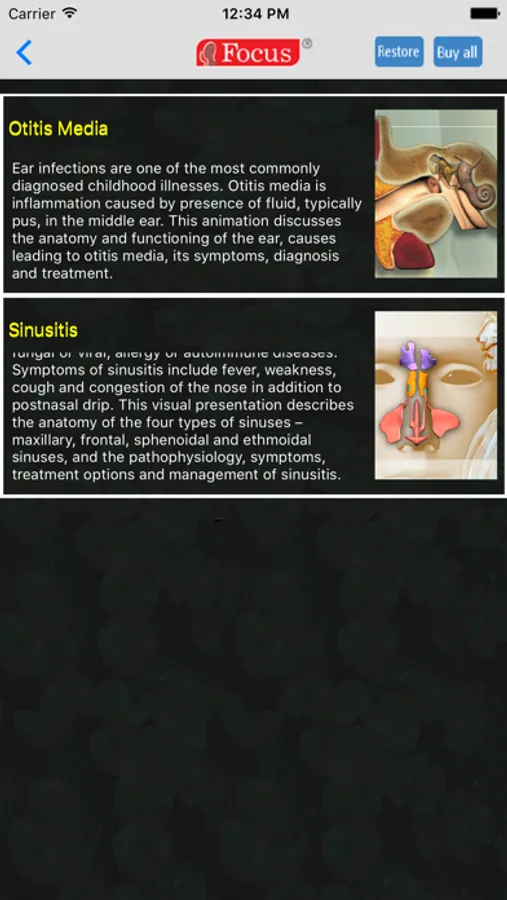 With this application, you can download animation titles on diseases and disorders of sensory organs like eye, ear and nose, that explain the anatomy and functioning of these organs, pathophysiology of the disease, its symptoms, causes, diagnosis, risk factors and treatment - therapies, procedures or techniques.