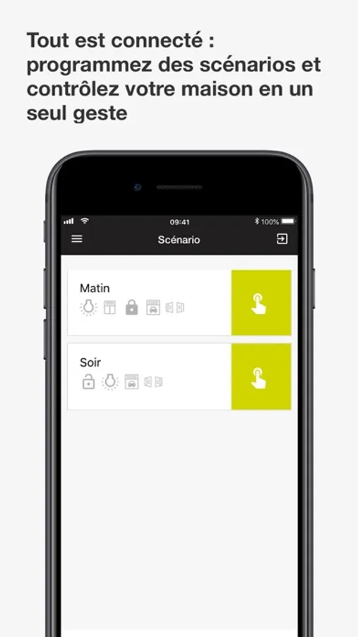 - Personnalisez et activez des scénarios, des actions simultanées en fonction de votre rythme de vie et de vos habitudes. Le matin, en quittant votre domicile, activez votre alarme, éteignez vos lumières et ouvrez votre porte de garage
