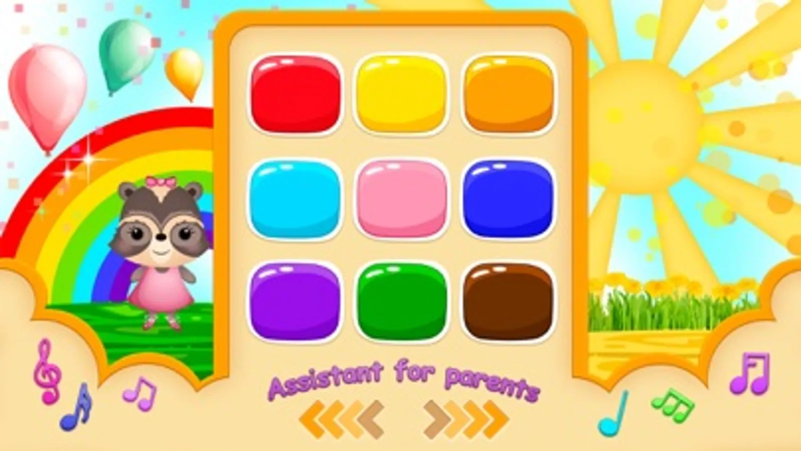 Learn the colors. Candy the Raccoon will help your child discover different colors: red and yellow, orange and green, cyan and blue, violet, pink and brown. Candy the Raccoon, being a little fashionista she is, will change her outfit according to each color. The kids will also visit the motley rainbow world for a fun musical air-balloon bursting adventure!