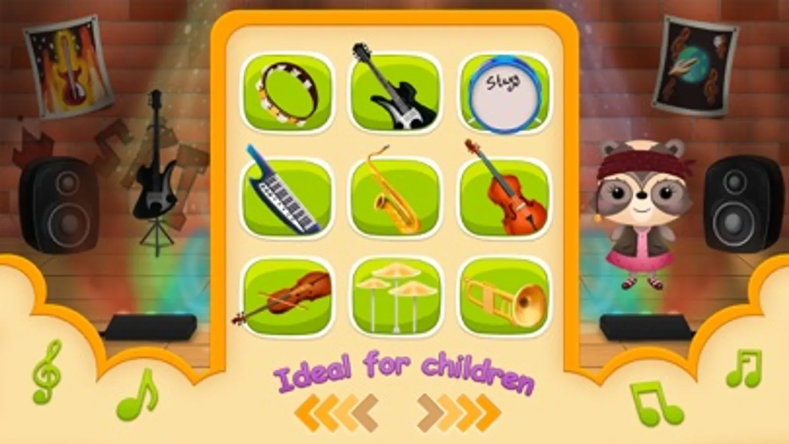 Discover the names of musical instruments. Candy the Raccoon will be delighted to play any of the many instruments in his personal collection for your child. Even toddlers will be able to hear the sounds of a tambourine, saxophone, electric guitar, drums, trumpet, violin, cymbals and synthesizer after simply selecting a relevant image.