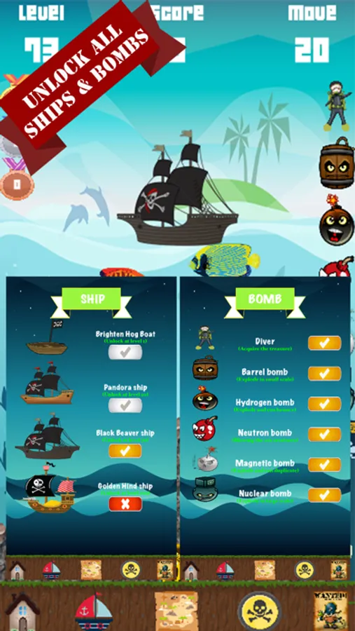 Rocks, fish and sharks are obstacles to get the treasures. Use bombs to break the rocks and diver to collect the treasures at the end. Every bomb provided has a special ability that gives a clear path for the diver.