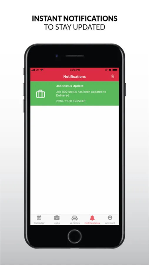 - Receive real-time push notifications when job status changes, or when a vehicle is speeding, stationary for too long etc.