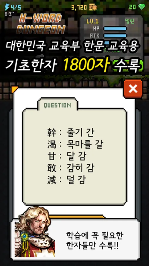 '한자 던전'에는 대한민국 교육부 한문 교육용 기초한자 1800자가 수록되어 있습니다.
